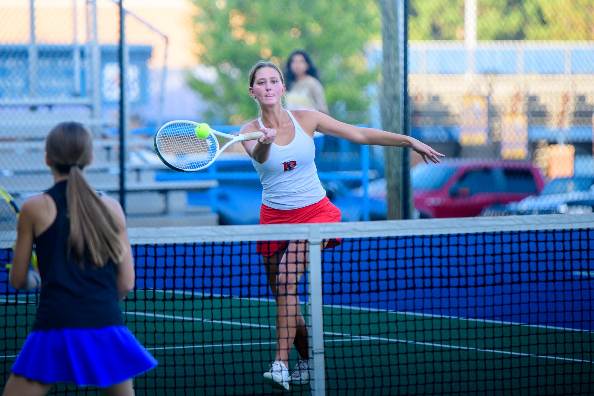 Nation Ford struggled in singles play, with Tejal Guntuboyina and Ansley Mcdonald both falling in straight sets. Jiya Guntuboyina also lost in two sets, giving Fort Mill the advantage. The Falcons’ two points came from Piper Land and Eva Mabey, who both secured decisive victories. Land defeated Kendell McCarty 7-5, 6-0, while Mabey rolled past Smitri Kirubakaran 6-1, 6-1.